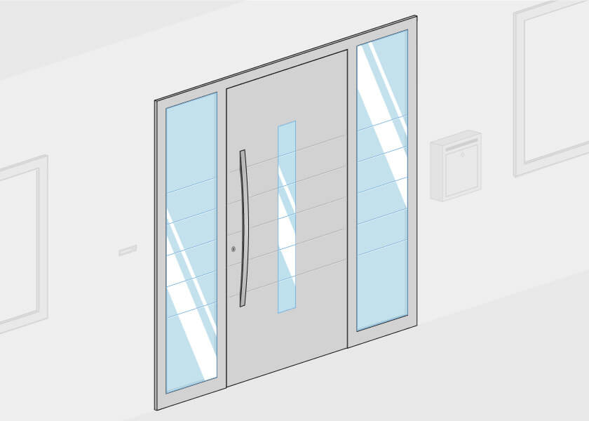 In the next step, you can select the type of glazing, e.g. safety glass and ornamental/structured glass. Further options such as a side panel and fanlight for additional light in the entrance area can be configured. Door hinges as well as safety locks and the front door handles can be specified.
